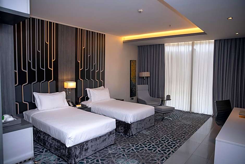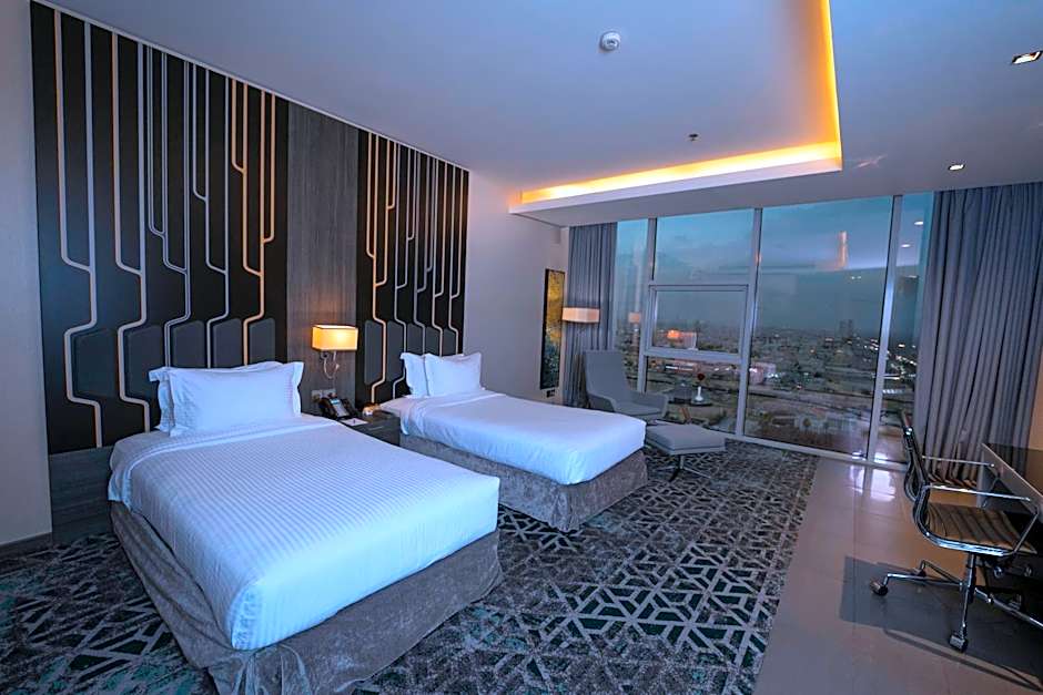 Providing free toiletries and bathrobes, this twin room includes a private bathroom with a walk-in shower, a bidet and a hairdryer. The spacious air-conditioned twin room provides a flat-screen TV with satellite channels, a mini-bar, a tea and coffee maker, a wardrobe as well as city views. The unit offers 2 beds.
